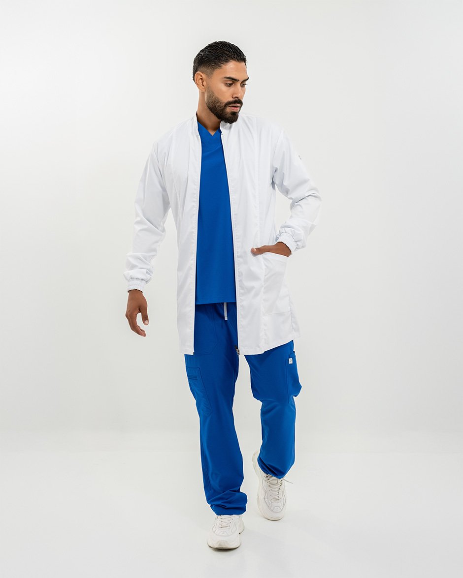 La chaqueta Alpha es una prenda larga y elegante que complementa tus scrubs con estilo.